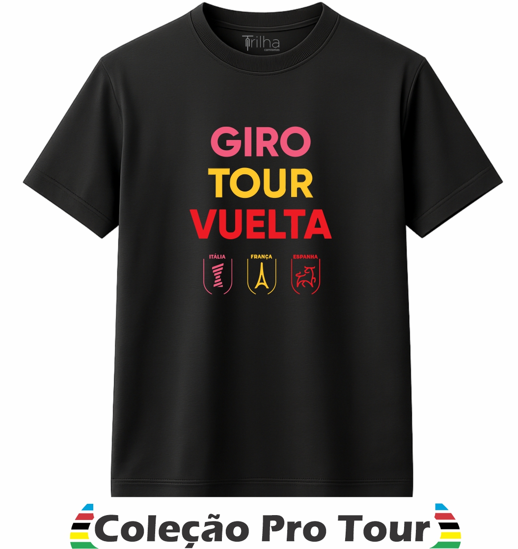 A Camiseta Masculina Pro Tour é uma homenagem às três maiores voltas do ciclismo mundial — Giro d’Italia, Tour de France e La Vuelta a España. Essa estampa representa o auge da performance e da paixão sobre duas rodas, celebrando os heróis que desafiam montanhas, ventos e limites em busca da vitória.